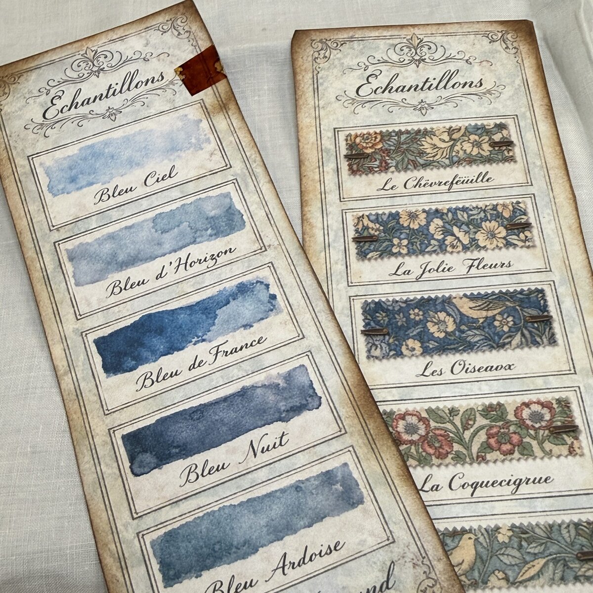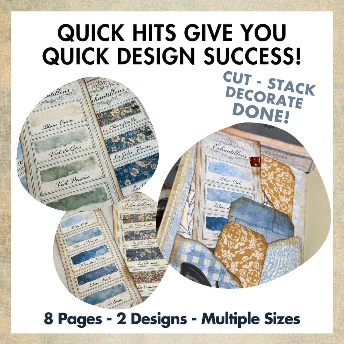 This French Blue Sample Cards Quick Hits Kit is designed to give you fast, satisfying results without the overwhelm. Simply cut, stack, and decorate with scraps, washi, fabric or paint to create stunning, vintage style sample cards that tuck perfectly into pockets, journals, folios, and happy mail.