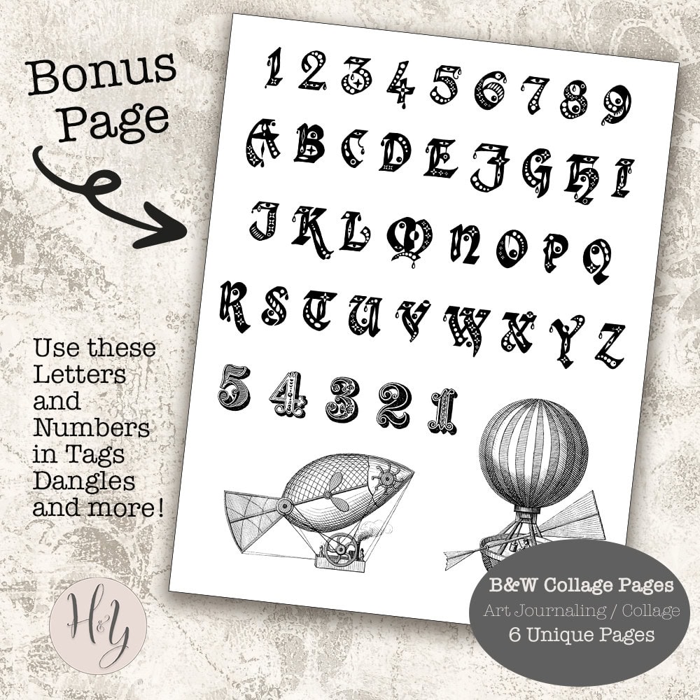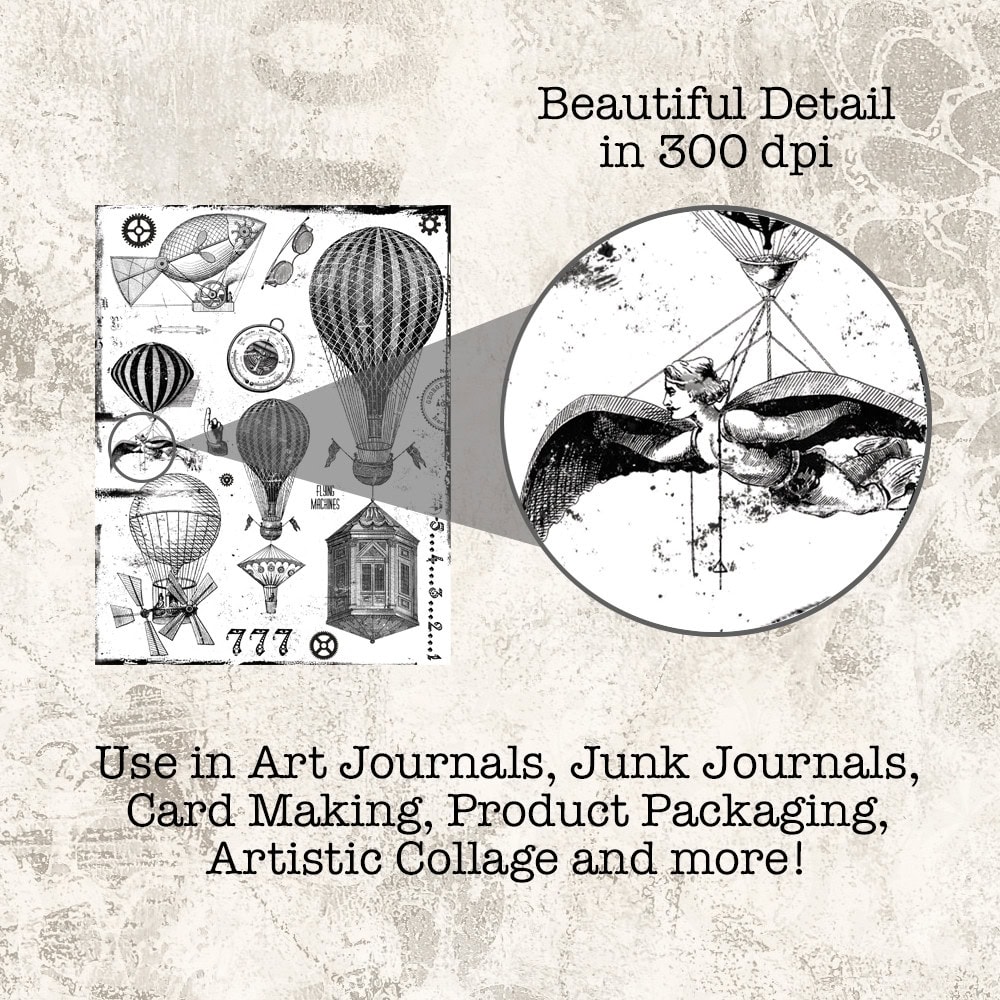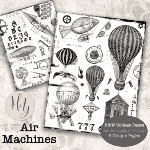 Digitally created sheets include 2 Collage Pages, 3 Patterned Pages and 1 Bonus page of letters and numbers. A magnificent set of steampunk Air Machine-themed collage pages.