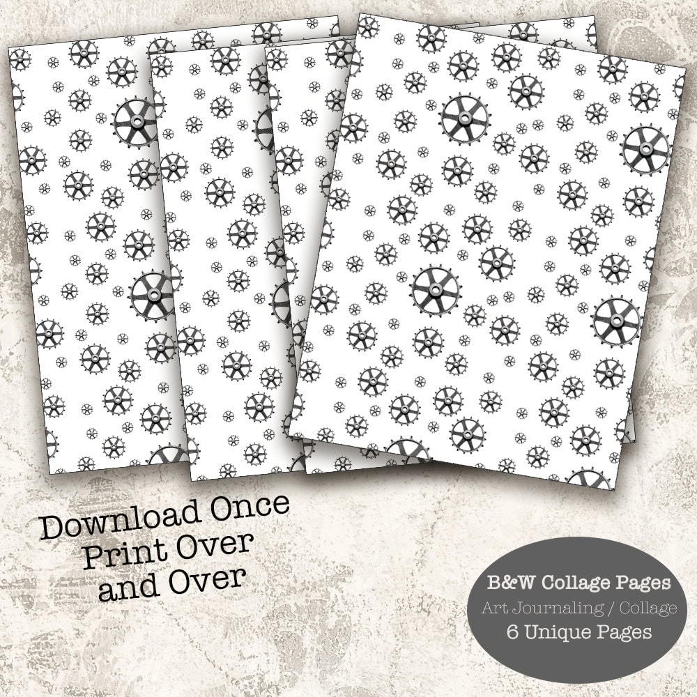 6 digital pages of black and white collaged paper printables.