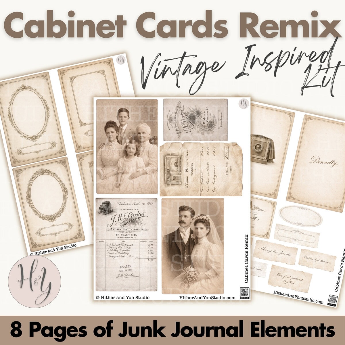 Cabinet Cards Remix is a vintage-inspired ephemera kit designed to help you recreate the look and feel of antique cabinet photographs without hunting for originals. This collection blends softly aged card bases, ornate frames, sepia and black-and-white imagery, and coordinating paper bits that layer beautifully into junk journals, folios, and memory-style projects.