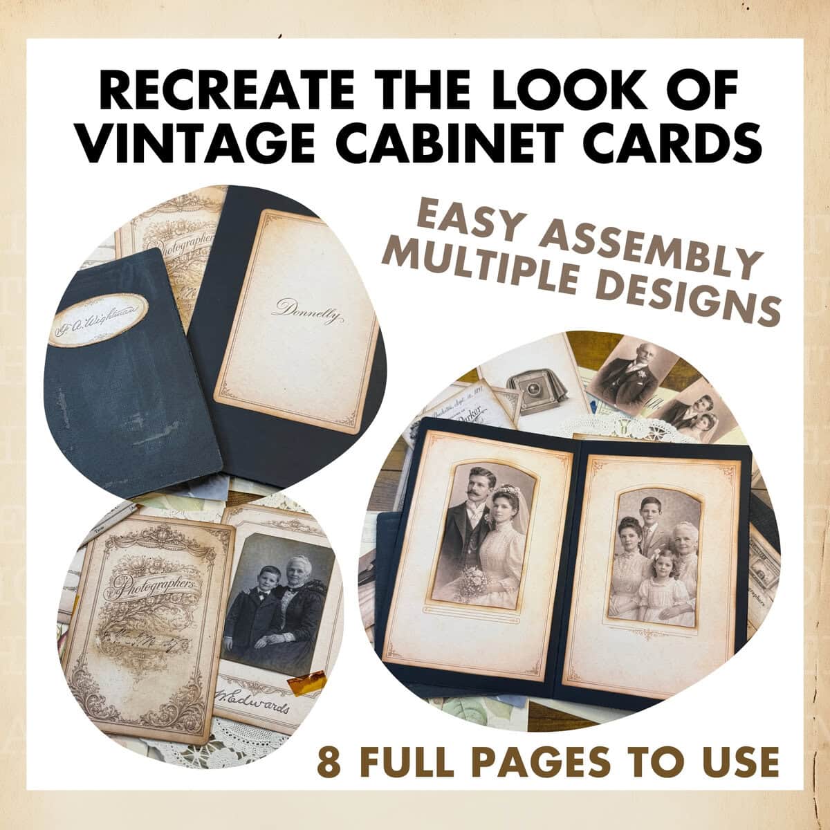 Each page was designed with easy assembly and repeat use in mind. Mix fronts and backs, add your own photos or portraits, or use the included images as-is for instant vintage charm.